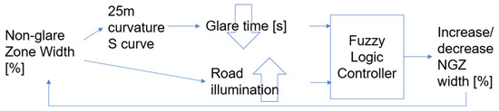 As shown in Figure 12, the two inputs to the controller are the glare rating and the road illumination rating. The glare rating is represented by the overall time that the lux reading is above the glare limit in a simulation, as discussed in the previous section. The road illumination rating can be represented by the non-glare zone width; this is because the road illumination is at its best when the non-glare zone is at its narrowest and at its worst when the non-glare zone is at its widest. Thus, they can be seen as inversely proportional. The wider the non-glare zone, the less area that is covered by the high beam area that benefits from the dynamic beam pattern of the ADB. The output of the controller is the change in non-glare zone width.