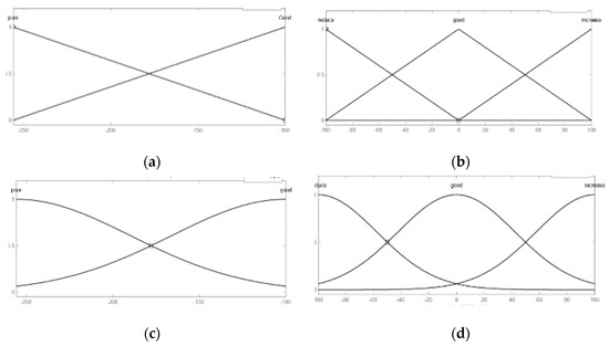 Membership function of fuzzy logic controller: (a) road illumination input triangular membership function in Trial 1; (b) change in non-glare zone width output triangular membership function in Trial 1; (c) road illumination input Gaussian membership function in Trial 2; (d) change in non-glare zone width output Gaussian membership function in Trial 1.