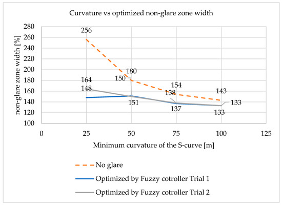 Table 6 and Figure 14 show the result of the best non-glaze zone width in different driving scenarios. The x-axis is the minimum curvature of the driving scenario, and the y-axis is the best non-glare zone width defined by the fuzzy logic controller. The top dashed line is the non-glare zone width when all glare is eliminated, which is in the extreme case of the best glare rating and the worst road illumination. The x-axis also represents the narrowest non-glare zone width, which is just as wide as the vehicle boundary box, when the road illumination rating is the best and the glare rating is the worst. The best value of the non-glare zone width should lie between these two lines, balancing the glare/road illumination trade-off. The two solid lines are the first and second trials of the fuzzy logic controllers using different membership functions. Those can be considered two balances of the road illumination and glare trade-off. Those two trials have very similar results, except in the S-curve with 25 m minimum curvature, in which the second trial prefers lower glare and the first one prefers better road illumination.