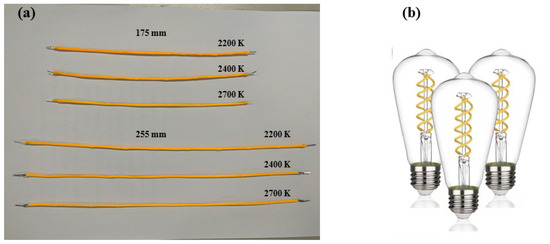 (a) Two filaments with different lengths (175 mm and 255 mm) under three color temperatures (2200 K, 2400 K, 2700 K); (b) LED filament bulb.