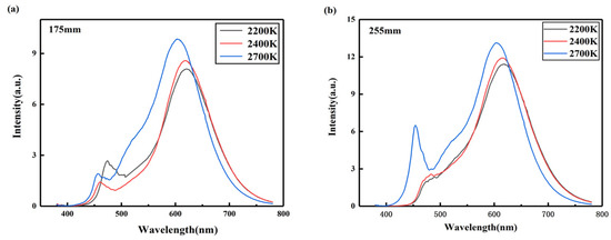 Electroluminescence spectra of (a) 175 mm LED filament and (b) 255 mm LED filament with CCTs of 2200 K, 2400 K and 2700 K.