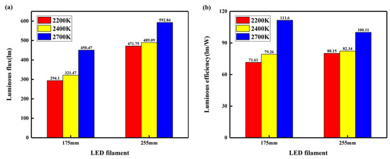 Two lengths of LED filament were used as the results for analysis. After the filament emits light for 30 min to reach a steady state, the power demands of 2200 K, 2400 K and 2700 K are 4.107 W, 4.056 W and 4.036 W, respectively. It can be seen from Figure 2 that under the same package structure, the luminous efficiency of the 2700 K filament is 111.6 lm/W, which is 35.8 % and 28.9 % higher than that of the 2200 K and 2400 K filaments, respectively. As a comparison group of the 255-mm LED filaments, after reaching a steady state, the powers of 2200 K, 2400 K and 2700 K were 5.886 W, 5.94 W and 5.922 W, respectively. The luminous efficiency of the 2700 K filament is 100.11 lm/W, which is 19.9% and 17.8% higher than that of 2200 K and 2400 K filaments, respectively. In terms of the light efficiency, the 2700 K filament is significantly improved compared to the other two filaments with lower color temperature. According to the conservation of energy, the heat loss of the 2700 K filament is much lower than that of the other two CCT filaments. That is to say, the heat loss of the 2700 K filament is significantly lower than that of the other two filaments.
