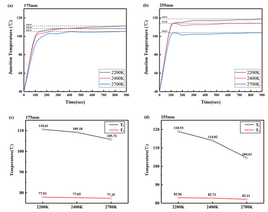 Figure 3 shows the difference in thermal performance of the filament at different color temperatures. As shown in Figure 4a,c, the temperature of the thermocouple glue point of filaments with different color temperatures varies within 0.6 °C, and the change range is not large. It shows that when the current is constant, the thermocouple glue point temperature has little relationship with the color temperature. As shown in Figure 4d, the thermocouple glue point temperature mainly depends on the material of the thermocouple itself and the passing current. As shown in Figure 4a,b, the junction temperature of the filaments of the two lengths reaches a steady state at about 300 s, and the junction temperature varies greatly. In the steady state, the junction temperature decreases with the increase of the color temperature. In the 175-mm LED filament result, the filament junction temperature decreased by 1.43 °C (2400 K) and 4.89 °C (2200 K), respectively. The CCT of the 175-mm LED filament is 2700 K, and the junction temperature is 105.72 °C in the steady state. The maximum temperature difference is 4.89 °C, which is 4.6% lower than the filament color temperature of 2200 K. The junction temperature of the 255-mm filament with a color temperature of 2700 K is 104.63 °C, and the maximum temperature difference is 14.3 °C, which is 13.7 % lower than that of the filament with a color temperature of 2200 K.