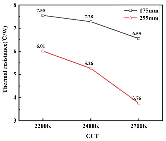 where represents the junction temperature, represents the temperature of the thermocouple glue point, and the unit of thermal resistance is °C/W. When the filament is made, the surface of the filament is fully covered by fluorescent glue and the contact surface with the chip is well sealed, so there is no contact thermal resistance due to the thermal convection of the interface itself. Formula (2) can be directly used to calculate the thermal resistance of the LED. The calculation result of thermal resistance is shown in Figure 5. Under the same lining condition, the thermal resistance change law is similar to the junction temperature, and it decreases for the filaments built for higher CCT. It shows that the heat dissipation capacity of LED filaments is different under different CCT. The heat dissipation capacity of LED filaments with low CCT is poor, and the junction temperature and thermal resistance are higher than those with high CCT.