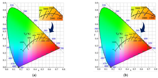 Chromaticity coordinate: (a) 175-mm filament; (b) 255-mm filament.