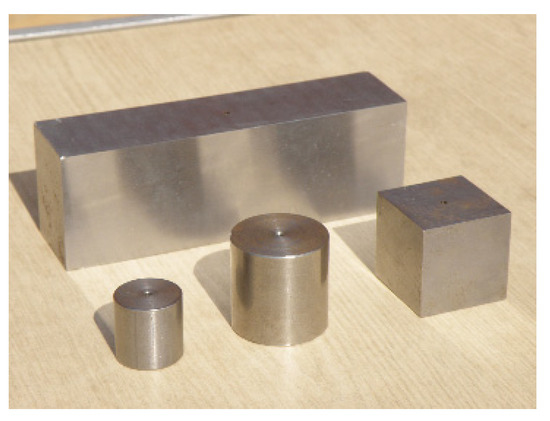 The aim of the presented work is to examine only the thermal effects. Mass transfer is not studied. That is why all tested samples are made of carbon steel (density ρ = 7820 kg/m3, specific heat c = 473.3 J/kg·K, and thermal conductivity λ = 42.9 W/m·K). Four samples were used: a small cylinder, a cylinder, a cube, and a cuboid (Figure 1). Sample dimensions are given in Table 1. In order to measure the temperature, holes with a diameter of 2.5 mm to a depth of 10 mm were drilled into the geometric centre of the samples. During the test, the measuring probe of the temperature recorder was placed in these holes.
