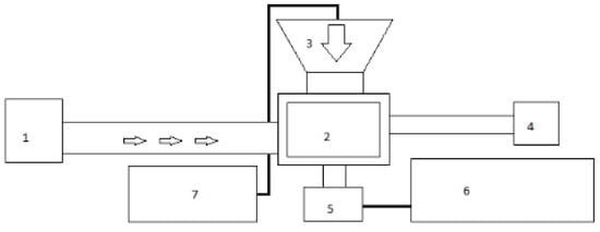 The scheme of the hybrid dryer: (1) air heater and fan, (2) dryer chamber, (3) ultrasound transducer, (4) microwave generator, (5) balance, (6) control system (PC), and (7) ultrasound generator.