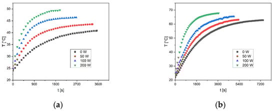 Temperature evolution of cubic sample. Applied US power: 0, 50, 100, 200 W. Air temperature: (a) 40 °C; (b) 60 °C.