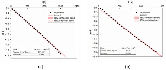 On the base of temperature evolution curves, the final temperature Tf was established and then the time evolution of the logarithm of dimensionless temperature ϑ was calculated (exemplary results are shown in Figure 4).