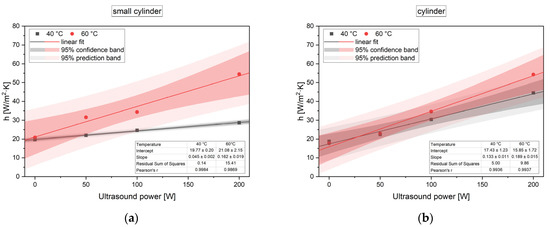 Dependencies of the heat transfer coefficient h on the applied ultrasound power are shown in Figure 5.