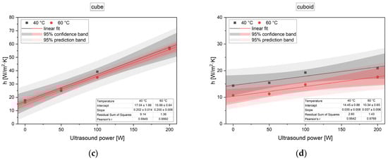The results confirmed that the greater the power of the ultrasound, the greater the improvement in heat transfer. In the investigated range of applied ultrasound power, the heat transfer coefficient is a linear function of the applied power (see Figure 5). It can be observed that the heat exchange enhancement strongly depends on the size of the samples. Due to the use of ultrasound, the convective heat exchange coefficient increased from 45% to almost 250%. There are few results in the literature describing the increase in the heat transfer coefficient due to the use of ultrasound. Aversa et al. [18] found a 12–44% increase in this coefficient and Kroehnke et al. [43] obtained a 34% increase, both in the case of carrot drying, while García-Pérez et al. [9] obtained a 65% increase in grape stalk drying. Heat transfer enhancement for both small (small cylinder) and large (cuboid) samples was smaller than the improvement in heat transfer for medium samples (cylinder and cube). In the latter case, an increase in growth of almost 250% of the heat transfer coefficients was achieved. The obtained results show that, in the studied temperature range, a higher air temperature is associated with a greater heat exchange improvement. This is contrary to the results presented by Garcia-Peres et al. [9] and Rodrigues et al. [14], who ascertained that an increase in temperature causes a decrease in the enhancement of heat transfer. This inconsistency may result from the difference in the construction of the dryers, particularly in the way the ultrasound is brought.