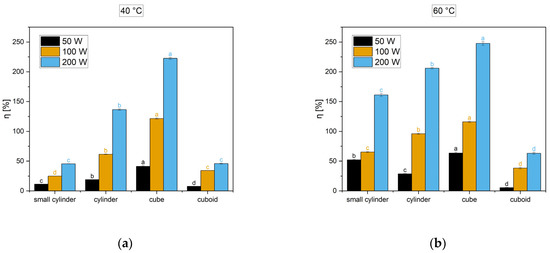 Heat transfer enhancement ratios η (%). Air temperature: (a) 40 °C; (b) 60 °C. Presented data are mean ± standard deviation. Different letters above the bar of the same color indicate statistically significant difference at p ≤ 0.05 in accordance to Tukey posthoc mean comparison.