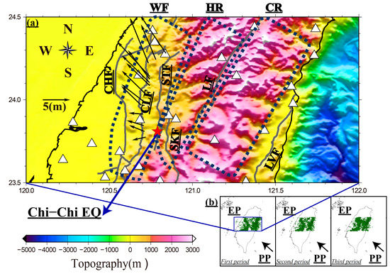 The great 1999 Chi-Chi earthquake (ML = 7.3; depth = 8 km) that occurred at the CLF has received the most attention. The SKF is on the east of the foreland basin, and to its west are the STF, CLF, and CHF. They represent the major geological structures of central Taiwan. In addition, the continental margin of the Eurasian Plate contains several Eocene rift basins [21,22,23], of which the Hsuehshan Basin holds an important part of the Taiwan orogenic belt [21]. The sedimentary stratum beneath the foreland basin can reach more than 6 km in thickness, and the deformation front is also included [24].