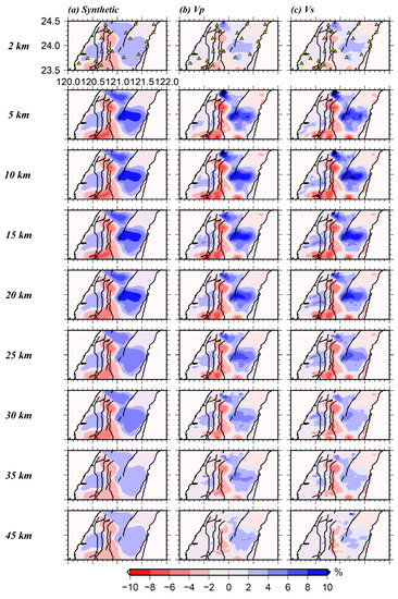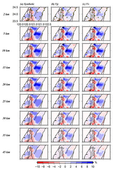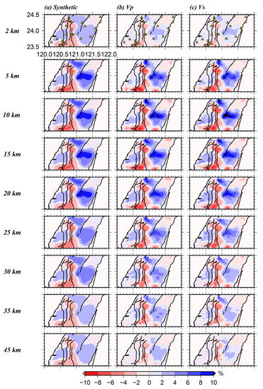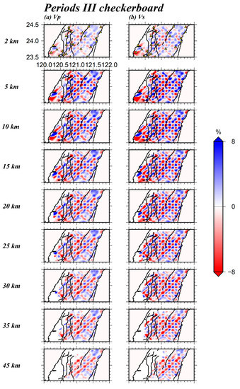 We utilized the 1D velocity model adopted by [17] and added a ±8% perturbation to Vp and Vs to generate a new 3D velocity model in the form of a checkerboard (grid dimensions: 10 × 10 km2 in horizontal space). Utilizing this 3D velocity model, the assumed travel times of P- and S-waves are calculated. The results yielded by the checkerboard test for each period are shown in Figure 2, Figure 3 and Figure 4.