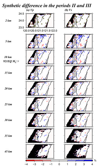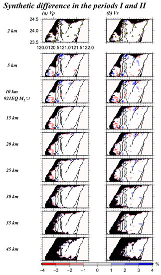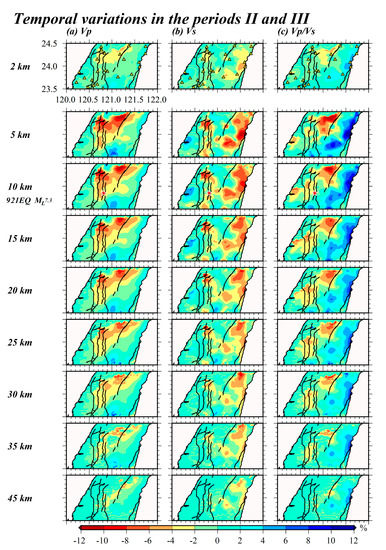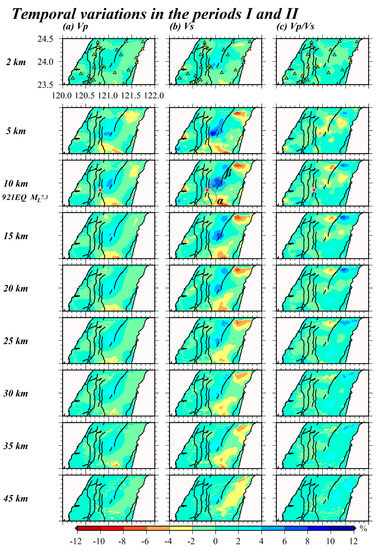 The results indicate that Vp decreased by approximately 2%, Vs decreased by approximately 4%, and Vp/Vs increased by approximately 4%. In the β zone (around the source area, see Figure 10b), Vp increased by approximately 4%, Vs increased by approximately 10%, and Vp/Vs decreased by approximately 6%. The results demonstrate that the subsurface structure had already changed before the impending Chi-Chi earthquake, and the reason for the significant decrease in Vs in the α zone compared with Vp is possibly the proliferation of cracks and fluid intrusion. The authors of [45] also speculated using a magnetotelluric technique that the seismogenic mechanism of the Chi-Chi earthquake may be associated with fluid intrusion. The velocity structure variation in the β zone was opposite to that in the α zone, presumably due to the closure of the crack, resulting in an increase in Vs. Figure 10b,c clearly show that, at depths of 5–10 km, the hypocenter of the Chi-Chi earthquake occurred in the boundaries of the areas of high and low Vp/Vs. However, no significant difference was noticed at depths greater than 15 km.