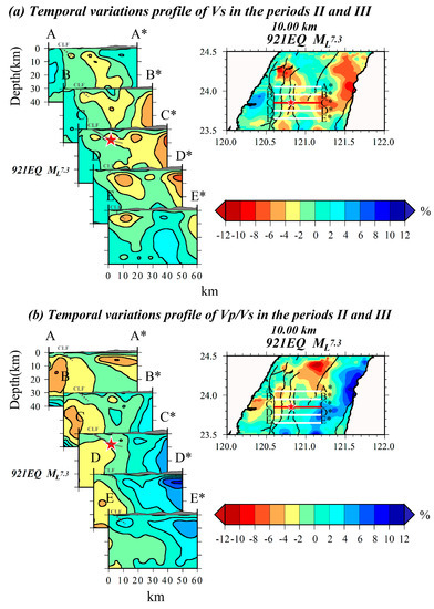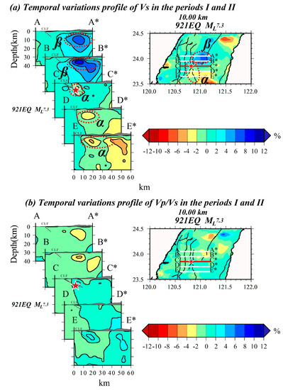 In this study, we discussed the relationship between the velocity structures of Vs and Vp/Vs over time and the geometry of faults in order to determine the variations in Vs and Vp/Vs before and after the occurrence of the Chi-Chi earthquake sequences along the velocity profiles. Figure 12 shows the time-dependent perturbation profile in periods I and II. It can be seen from the section of CC*–EE* connection that in the α area (hypocenter) during the Chi-Chi earthquake, Vp/Vs increased by approximately 4% and Vs decreased by approximately 4%.