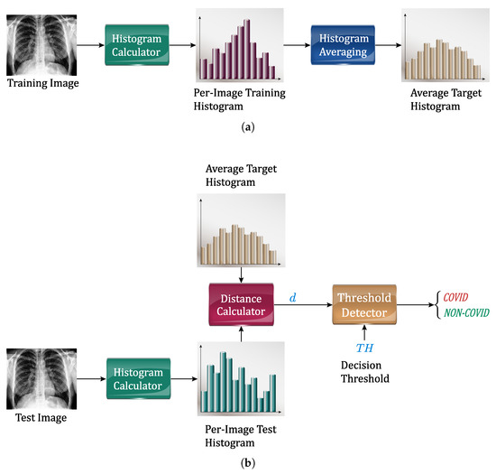 Proposed approach: (a) evaluation of the target histogram, and (b) inference phase for an unknown image.