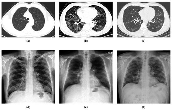 Examples of some chest CT and CXR images: (a) CT normal, (b) CT common pneumonia (CP), (c) CT novel coronavirus pneumonia (NCP), (d) RX normal, (e) RX CP, and (f) RX NCP.