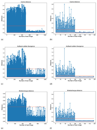 The obtained distances on the considered CT and CXRs datasets, and related threshold (the red lines) set using (2). The distances are: (a) Cosine for CT, (b) Cosine for CXRs, (c) Kullback–Leibler divergence for CT, (d) Kullback–Leibler divergence for CXRs, (e) Bhattacharyya distance for CT, and (f) Bhattacharyya distance for CXRs. The distance behaves as in the KL and Bhattacharyya distances; hence, it is not explicitly shown. The results have been obtained by selecting reference images and a number of histogram bins. The threshold in (2) has been set to for the CT dataset and to for CXRs.
