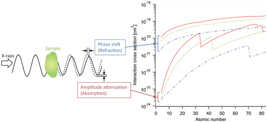 In principle, the use of X-ray phase shifts can improve sensitivity by several orders of magnitude compared with imaging methods that use X-ray absorption. This is mainly due to the fact that the cross section of the elastic scattering of X-rays by electrons (Thomson scattering) is larger than that of photoelectric absorption. As shown in the right pad of Figure 1, the phase shift cross section is several orders of magnitude larger than the absorption cross section for a given energy, especially for light elements with small atomic numbers. By taking quantitative X-ray phase-contrast images from various directions, the so-called phase CT can be realized. In this case, what is reconstructed in the CT is a physical quantity corresponding to the deviation of the refractive index from 1 (refractive index decrement) for X-rays, which is proportional to the density of electrons per unit volume, except in special cases where the energy of X-rays used is close to an absorption edge. The refractive index decrement is about to , which is so small that X-rays are hardly refracted, but it can be detected by special methods as described below. Note that the absorption of X-rays is described by the imaginary part of the complex refractive index, which is about to several orders of magnitude smaller.