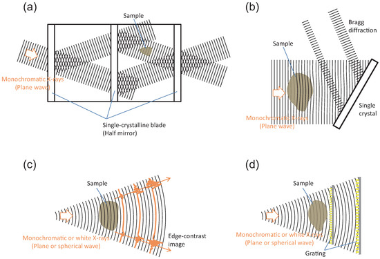 Four typical optical systems that have been proposed as methods for realizing X-ray phase-contrast imaging are compared in Figure 2. The method in Figure 2a is called “crystal interferometry” [6,7,8,9], which uses a Mach–Zehnder interferometer using Bragg reflection by a single crystal. Figure 2b shows diffraction enhanced imaging (DEI) [10,11,12], a method using an analyzer crystal, which detects the slight refraction of X-rays by an object by utilizing the very small angular width of the Bragg reflection of a single crystal (about 10 rad). The imaging methods in Figure 2a,b require monochromatic X-rays, so the measurement time for obtaining a projection image is generally on the order of seconds even when highly brilliant synchrotron radiation X-rays are used. The methods in Figure 2c,d are called the “propagation-based method” [13,14,15,16] and “grating interferometry” [17,18,19,20,21,22,23,24], respectively, and can use X-rays with a wide energy bandwidth (continuous X-rays) and spherical waves, which means that high-intensity X-rays can be used. Therefore, they are suitable for imaging with a high temporal resolution. The propagation-based method can be realized with a very simple configuration consisting only of a sample and an image detector. Images with enhanced edges can be obtained on the basis of the interference between slightly refracted X-rays inside and outside the boundaries of the structures in a sample. However, the pseudo-homogeneous assumption [16] is required for the quantitative analysis of the phase shift. Grating interferometry, in comparison, allows for quantitative imaging without any special assumptions. Another advantage of grating interferometry over the propagation-based method is its multi-modality; three independent projection images, absorption, differential-phase, and visibility-contrast images [23,24] can be obtained, as shown in Figure 3.
