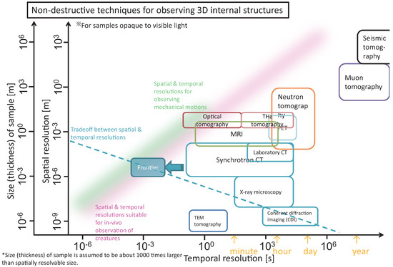 The trade-off between temporal and spatial resolutions (dashed line) is also shown in Figure 4. To increase the temporal resolution, it is generally sufficient to sacrifice the spatial resolution. In fact, temporal resolution on the order of milliseconds has been achieved for a spatial resolution reduced to the order of millimeters. It is worth noting, however, that the direction of this trade-off relationship is close to orthogonal to the pink and green zones. In other words, the smaller the observation object, the larger the demand for high-speed viewing, but improving both spatial and temporal resolutions is often technically challenging.