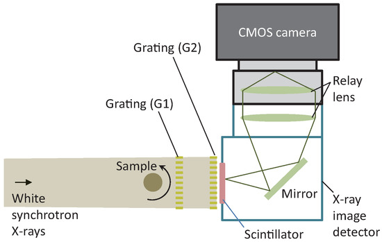 The experimental setup (side view) is shown in Figure 5. Here, we used X-ray grating interferometry. As described in Section 2.1, this method uses gratings for X-rays (the two gratings in Figure 5), and it has the advantage that a white synchrotron radiation beam with high intensity and a relatively large area can be used.
