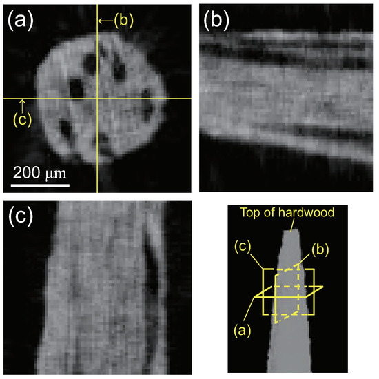 Phase tomogram of piece of hardwood obtained by X-ray grating interferometry using white synchrotron radiation (exposure time: 4.43 ms) [29]. Copyright (2018) The Japan Society of Applied Physics (a) Axial, (b) sagittal, and (c) coronal images.