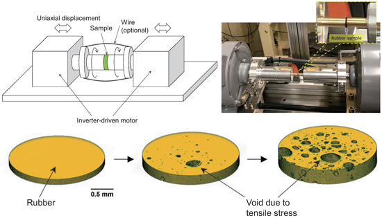 Recently, dynamic 4D observation has also become possible. Figure 7 demonstrates 4D X-ray CT with a temporal resolution of 10 ms for the process of breaking rubber while pulling it [41,42]. The upper left pad of Figure 7 shows a schematic illustration of the rotating device for the 4D X-ray CT. It comprises two coaxial inverter-driven motors, which can be electrically synchronized by a motor controller. The motors for rotation are mounted on two carriages on parallel stainless-steel rails and are uniaxially movable along the rails in the direction parallel to the rotation axis (in the horizontal direction). The rubber sample was bonded on top of the motor axes, as shown in the upper right pad of Figure 7, and stretched while rotating at high speed.