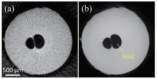 If we try to further shorten the acquisition time, the number of projections has to be reduced because the frame rate cannot be increased while maintaining the field of view. Figure 8a shows a tomogram of a polypropylene (PP) sphere with a diameter of 3/32 inches acquired at 2.0 ms. Here, the projection images were obtained by the same experimental setup as that of Figure 5, but the Fourier transform method [43] was used instead of the fringe scanning method. In the Fourier transform method, a differential phase image can be obtained from a projection image with fine moiré fringes, so that higher temporal resolution is realized than that of the fringe scaning method, although the spatial resolution becomes worse up to the period of the moiré fringes. We obtained the projection images at a frame rate of 37,500 frames per second with a field of view of 256 × 256 and rotated the sample at a speed of 29,605 rpm. To increase the field of view, the so-called offset CT was used: the two projections from opposite directions were combined to obtain a single projection image. Since only 76 projections for a half turn of the sample can be obtained, using the classical CT reconstruction algorithm (filtered back-projection algorithm) results in radial artifacts as shown in the left pad in the figure.