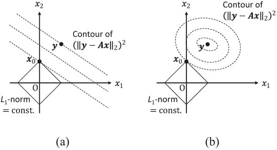 Schematic illustration of how sparse solutions are more easily selected by using norm for ((a) , (b) ). Solid line represents line with constant norm, and dashed line represents contour line of . In figure, is point that minimizes under constraint of constant norm, i.e., solution to optimization problem in Equation (7) (solution with ). Note that cases of can be illustrated similarly to (b), but is generally not in - plane.