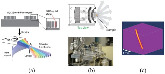 Figure 10a shows the principle of the multi-beaming technique we developed to realize X-ray CT without sample rotation. A 100 m-thick Si single crystal was etched into the shape shown in the upper figure of Figure 10a by microfabrication [50], and when it is bent, the small rectangular plates at the top (hereinafter called “blades”) point in different directions in accordance with the orientation of the lower part of the crystal. If the Si wafer is curved along a hyperbola, the reflected beams will converge toward the sample. As mentioned above, the resonance width of Bragg reflection is very narrow, so the energy bandwidth of the reflected X-rays is very small. Therefore, the transmitted X-rays can be reused. Figure 10b shows the hyperbolic-shape multi-beam optical element we developed [31]. The element can generate 32 beams covering a range of . Figure 10c is a 3D CT reconstruction image acquired with an exposure time of 1 ms using a 50-m diameter tungsten wire as a sample. The spatial resolution of the tomogram was 65 m. We used the state-of-the-art CT reconstruction algorithm based on compressed sensing described in Section 3.2.
