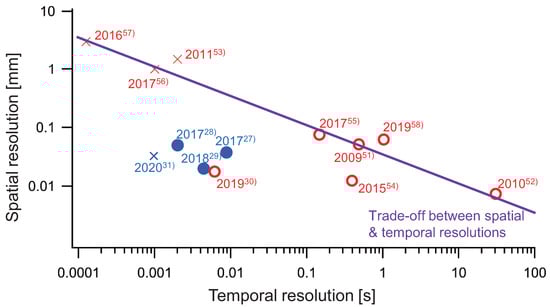 Summary of spatio-temporal resolutions we achieved (blue filled circles and cross) in comparison with those of other representative reports (red open circles and crosses). Circles and crosses represent achievements with and without sample rotation, respectively.