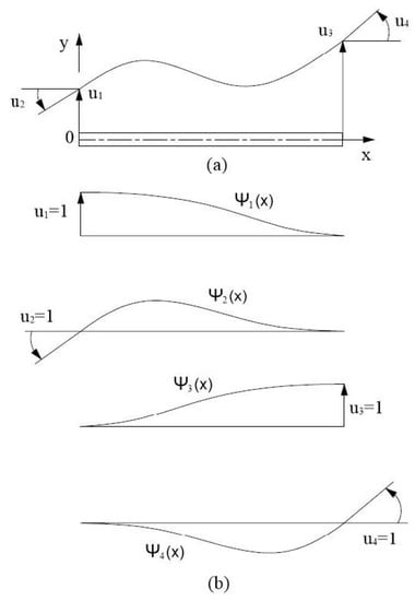 where , , and are the cubic Hermite interpolation functions, which ensure the continuity of deflection and cornering between beam units at the boundary.