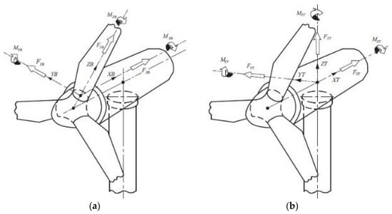 The load on the wind turbine tower is mainly from the inertial load on the top mass of the tower and the aerodynamic load on the rotating blades. The blade load and tower top load can be decomposed into component forces and bending moments along the three coordinate axes, as shown in Figure 5.