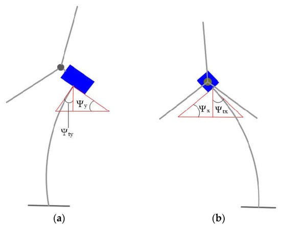 The deflection of the tower top in downwind direction and crosswind direction will be equal to the fore-and-aft displacement and left–right displacement of the nacelle respectively, and the angle of rotation of the tower top in fore-and-aft direction and left–right direction will be equal to the pitch angle and cross-roll angle of the nacelle, respectively. The relationship between the tower top turning angle and the nacelle attitude angle is shown in Figure 7.