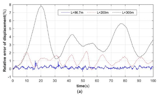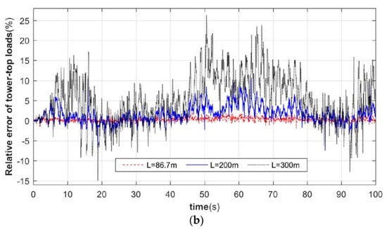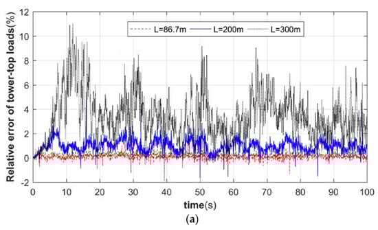 To investigate the law of mutual influence between tower vibration and pneumatic load, we compared the relative errors of tower top angle and displacement under three tower heights, and the simulation results are shown in Figure 9 and Figure 10.