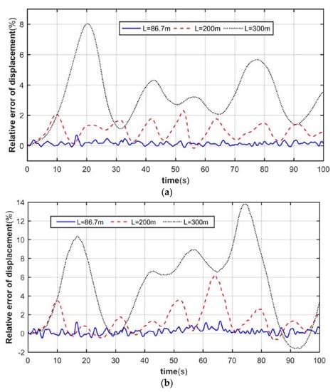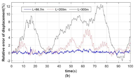 Relative error of tower top displacement. (a) Longitudinal direction. (b) Crosswind direction.