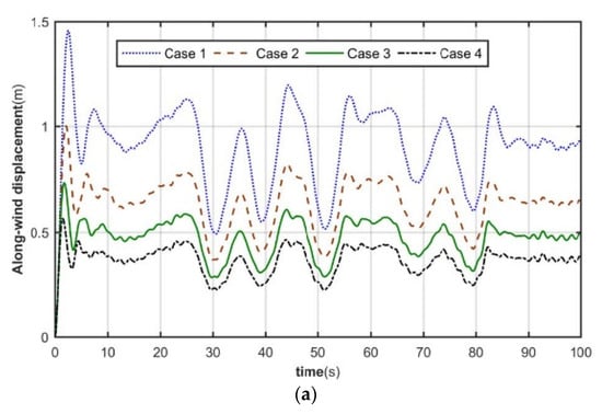 For each of the four foundation cases in Table 5, the wind load response of the tower system is solved, and the effect of the foundation rotational stiffness on the tower vibration is explored. When considering the flexibility, the wind turbine tower top response time equations are shown in Figure 11 and Figure 12.