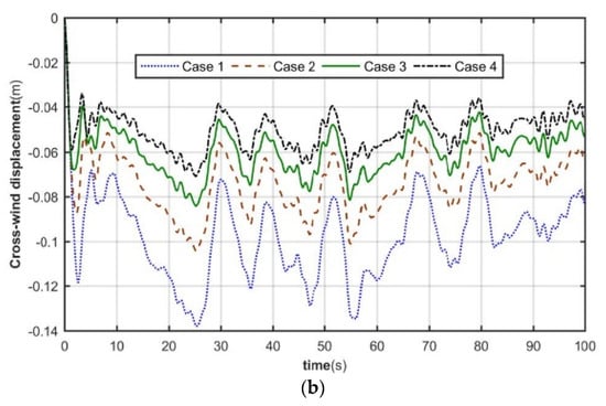 As shown in Figure 11, the maximum displacements of the tower top in the downwind direction are 1.2 m, 0.82 m, 0.61 m, and 0.46 m. The maximum lateral displacements of the tower top are 0.14 m, 0.1 m, 0.08 m, and 0.07 m. It can be seen that the deflection of the tower top increases greatly when considering flexibility. Compared with the rigid foundation, the maximum tower top displacement of Case 1, Case 2, and Case 3 increases nearly 161%, 78%, and 32% in the downwind direction and nearly 100%, 42%, and 14% in the sidewind direction, respectively.
