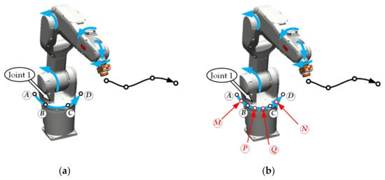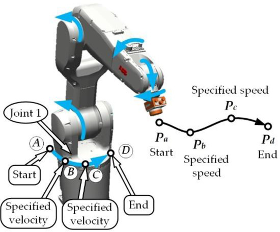 As shown in Figure 3, the end-effector moves from start point Pa to end point Pd. It needs to pass through two intermediate target points Pb and Pc at specified speeds, and joints should rotate accordingly. Taking joint 1 as an example, joint 1 correspondingly rotates from the start point A to end point D, passing through the intermediate target points B and C at constrained velocities. Therefore, joint 1 carries out PTP motion via multiple points at constrained velocities. By solving the inverse kinematics function, all joints’ angular displacements and angular velocities at each target point can be obtained from the positions, orientations and speeds of the end-effector, so that the rotation trajectory of joint 1 can be piecewise-planned, from point A to point B, from B to C, and from C to D. Other joints can carry out similar rotation plannings. Finally, the movement of the end-effector is synthesized by all joints’ rotations together.