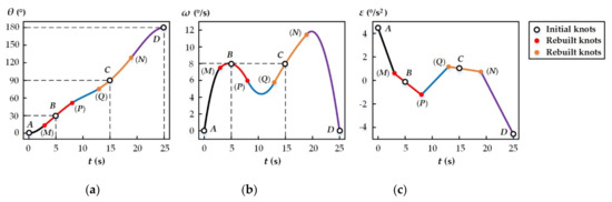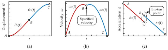 where, t0, t1, θ0, θ1, ω0, ω1 have the same physical meanings as in formula (6) and εa and ε1 are the angular accelerations at the target points, which need to be given arbitrarily in advance. After finding out the coefficients, the quintic polynomial planning function can be obtained. As can be seen from Equation (8), as long as the angular accelerations at the connection point of two adjacent plannings are set equal, the angular acceleration continuity is consequent.
