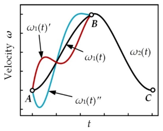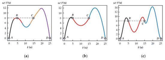 Figure 14 is the angular velocity curves obtained by these three methods. In Figure 14a, the velocity curves obtained by the proposed method are smooth, the velocity fluctuation is gentle, and the variation trend is roughly similar to that in Figure 14b by the cubic polynomial. In Figure 14b, the overall velocity waveform by a cubic polynomial is simple and appropriate. However, there are turning points at junctions B and C, which will lead to discontinuous angular acceleration at the connection points. In Figure 14c, the overall fluctuation of the velocity curves by a quintic polynomial is obviously large. In particular, because of inappropriate preset angular acceleration at point C, the velocity near point C fluctuates back and forth sharply, which is not conducive to the control of joint rotation speed. This shows that quintic polynomial planning is likely to cause angular velocity to fluctuate too much. Moreover, the higher the order of the polynomial is, the higher the velocity peak will be, which makes greater volatility. These are the weaknesses of quintic polynomial planning.