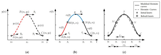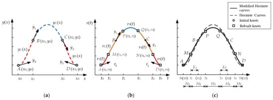 These four Equations (26)–(29) are all linear ones of the unknowns r1, r2, and . By solving the Equations, the values of r1, r2, and can be obtained. After acquiring the positions and the 1st derivatives at newly-built knots A, M, N, and C, modified cubic Hermite interpolation curves can be obtained according to formula (18).