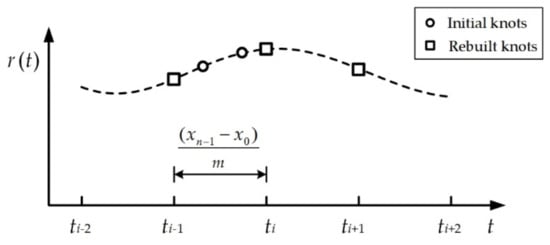 Based on the principle of average for new knots, the horizontal distance between the second and the third initial points is divided into three segments, so the abscissas t2 and t3 of the new knots R2 and R3 can be expressed as Equations (35) and (36) below. The same scheme is applied whenever there are two newly-built knots between every two adjacent initial points.