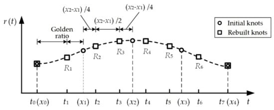 Between the first and the second initial points, is there only one newly-built knot R1 inserted, seen in Figure 10. The horizontal distance between the first and the second initial knots is divided by new point R1 into two segments with unequal length, so the golden ratio is a reasonable method. Consequently, the abscissa t1 of newly-built knot R1 can be expressed by Equation (37). The same is as for the last newly-built knot R6, and the abscissa t6 of the newly-built knot R6 can be expressed by Equation (38).