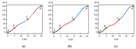 Figure 13 shows the angular displacement curves obtained by the proposed methodology, cubic polynomial, and quintic polynomial respectively. As can be seen from Figure 13a,b, the angular displacement curve obtained by the proposed method is similar to the curves obtained by the cubic polynomial. Both of the curves are smooth and the fluctuation is very small. In Figure 13c, the angular displacement curves obtained by quintic polynomial fluctuate a little bit. In fact, a curve with a higher order is more likely to fluctuate than a curve with a lower order. Therefore, we should try to avoid using higher-order functions for planning.