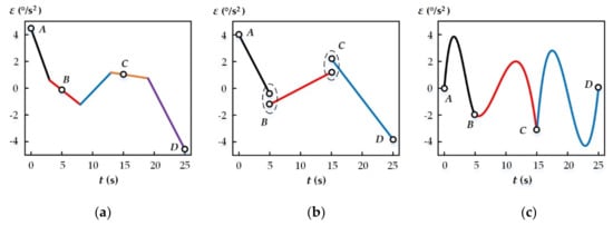 Figure 15 is the angular acceleration curves obtained by these three methods. As can be seen from Figure 15a,c, the angular acceleration curves, obtained by proposed methodology and quintic polynomial respectively, are both continuous at connection points. Because the order of the quintic polynomial is high, the angular acceleration in Figure 15c is also easy to fluctuate. In Figure 15b, the angular acceleration curves obtained by cubic polynomial are obviously broken at the connecting points B and C. The angular acceleration discontinuity of the joint will cause vibrations and impacts, which will degrade the working performance and decrease the service life of industrial robots.