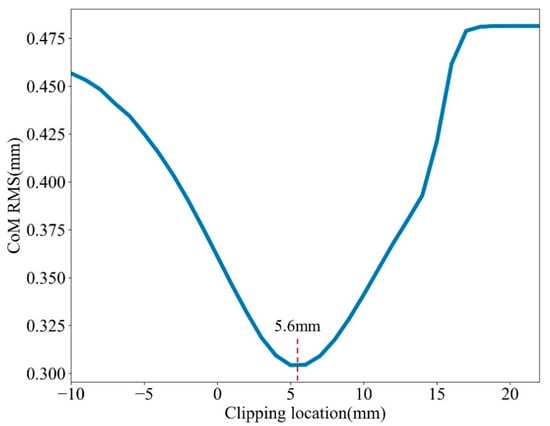 where r is the distance between the clipping location from the reference point. Based on the Equations (9) and (11), the distribution of fit residuals and the corresponding CoM are calculated at different acceptance levels by adjusting the value of r. Figure 6 shows the relationship between clipping location and mean value RMS of CoM. Due to the distortion at the front and back edge of the fit residuals distribution, the curve of mean value RMS presents to be concave. We define the minimum (5.6 mm) in the curve as the clipping location in the new method to reduce the system error introduced by the variation of satellite signature effect for short-time and obtain the best stability of observation data.