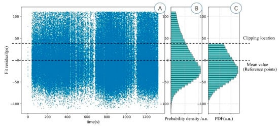The diagram of the clipping method. (A), the distribution of range residual accepted by Poisson filter and rejection of 2.5 × RMS. (B), the histogram of the preliminary processed range residual distribution. (C), the distribution of the selected range signals lay between the reference point and clipping point.